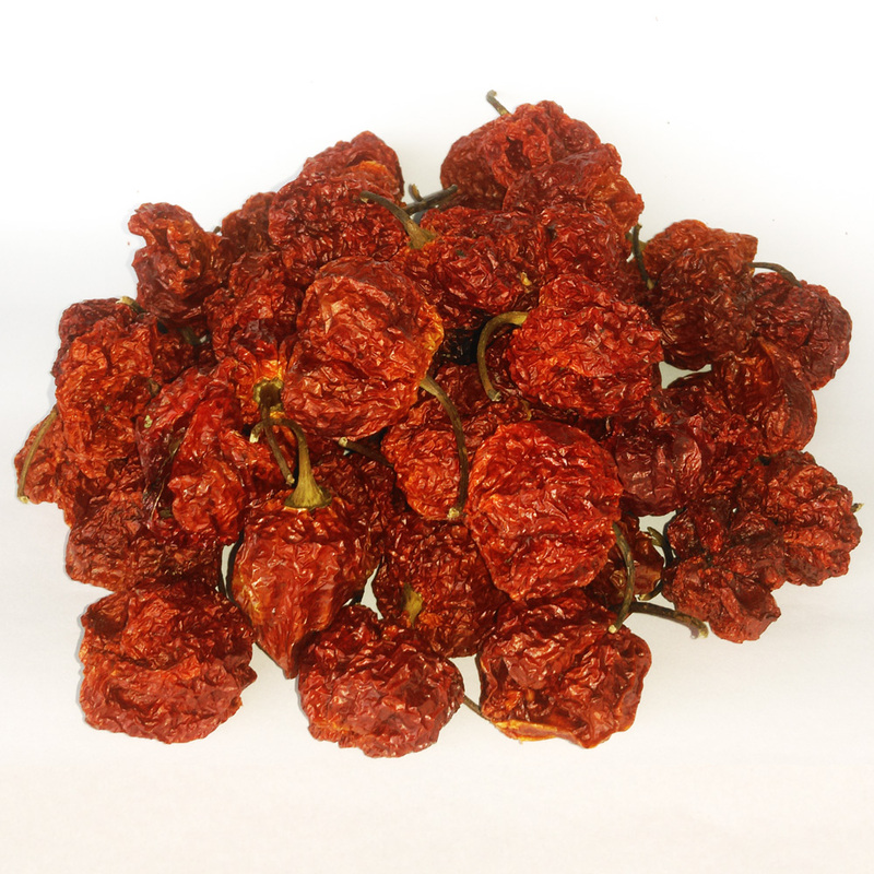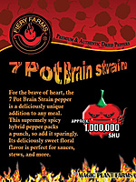 Our natural 7 Pot Brain Strain packs a powerful heat at 1,000,000 to 1,350,000 (SHUs). Our peppers have the classic "creeper heat." The burn intensifies with time. So those few seconds prior to that—this respected pepper actually has a really nice complex sweet and fruity flavor! Our 7 Pot Brain Strain ground pepper, crushed flakes and dry whole pods are insanely hot (spicy) so use with common sense and caution. Remember, the heat intensifies after eating so start with a very small taste test to gauge your heat tolerance.