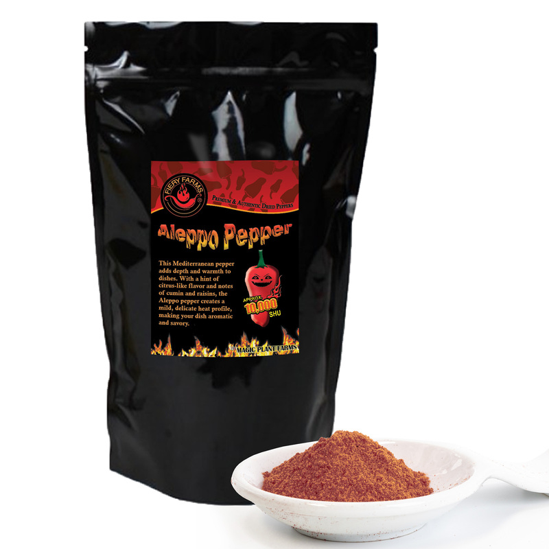 Aleppo Peppers are known to be a favorite among gourmet chefs and fans of Mediterranean cooking! So why eat it? Like most chili peppers, in certain amounts the sensation can be quite pleasing and causes the release of endorphins in the brain, which make you feel pleasure. Studies suggest that Capsaicin may have certain health benefits, such as pain relief, improved digestion, and potential metabolism-boosting effects. Eat with caution but enjoy the complex flavor provided by Magic Plant Farms' Aleppo peppers. Use our premium quality dry chili pepper products once and you’ll be hooked forever! This pepper is perfect in generous doses for a specific aromatic kick in stews, sauces, grilled meats, and hummus. For those who love a savory finish, just add more directly on top!