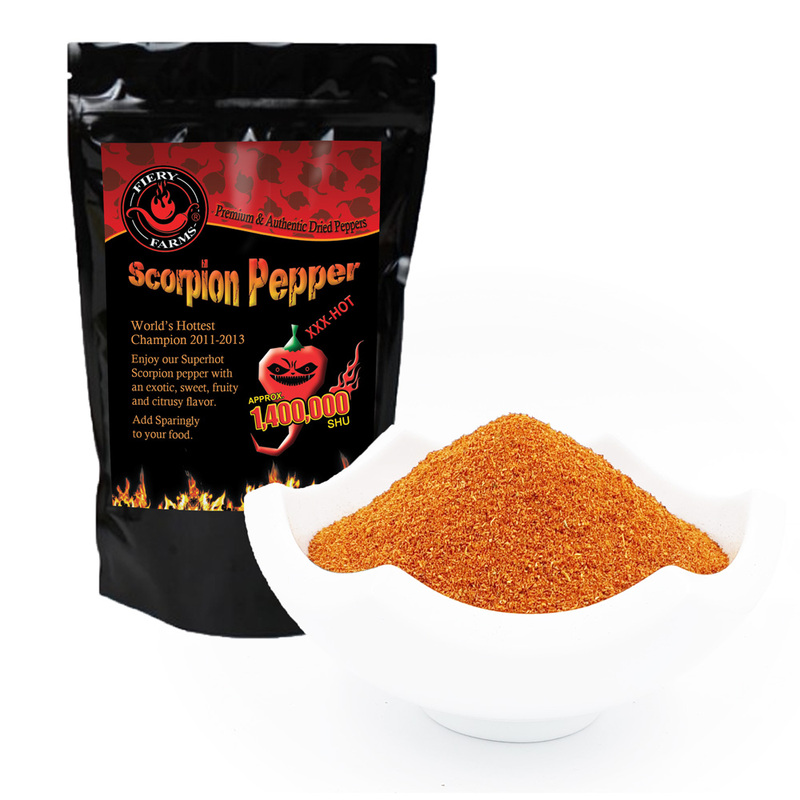 Our natural Red Trinidad Scorpion Butch T packs a powerful heat at 1,200,000 to 1,460,000 (SHUs). Unlike the "creeper" varieties, the Scorpion is known for its aggressive, upfront sting. So those few seconds prior to that—this respected pepper actually has a really nice complex sweet and floral flavor! Our Trinidad Scorpion ground powder, crushed flakes, and dry whole pods are insanely hot (spicy), so use with common sense and caution. Remember, the heat hits quickly and lingers, so start with a very small taste test to gauge your heat tolerance.